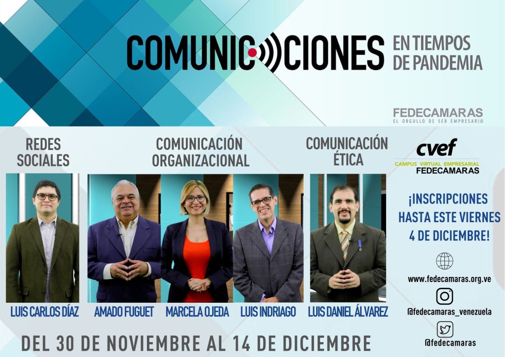 Con el propósito de compartir conceptos, métodos y herramientas de comunicación en el actual entorno de crisis sanitaria, FEDECÁMARAS desarrolla a través de su plataforma Campus Virtual Empresarial (cvef) el Programa “Comunicaciones en tiempos de pandemia”. Pueden inscribirse comunicadores, emprendedores, gremialistas, profesionales, estudiantes y público en general interesado en esta materia.
